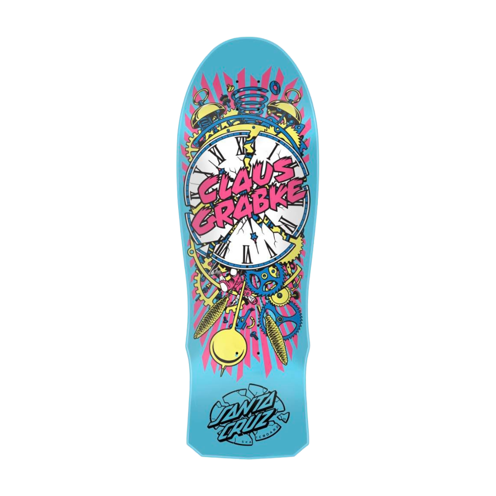 Santa Cruz Skateboards Claus Grabke Exploding Clock Reissue deck featuring newly remastered spot matte neon graphics on full dip neon green deck with laser etched 2024 reissue decktop logo.
