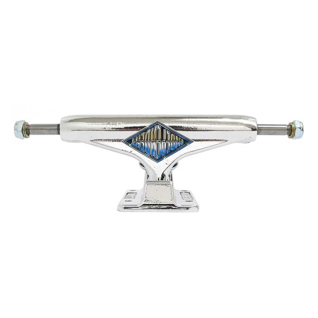 Independent Trucks Chrome Summit featuring chromed silver hanger and baseplate, metallic chrome pad printed logo, black cushions, and silver hardware on Forged Hollow Standard truck with hollow inverted kingpin.
