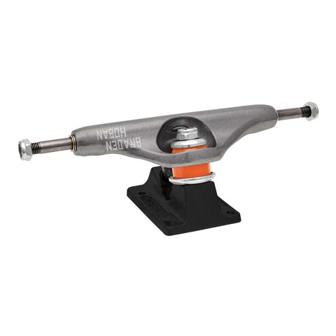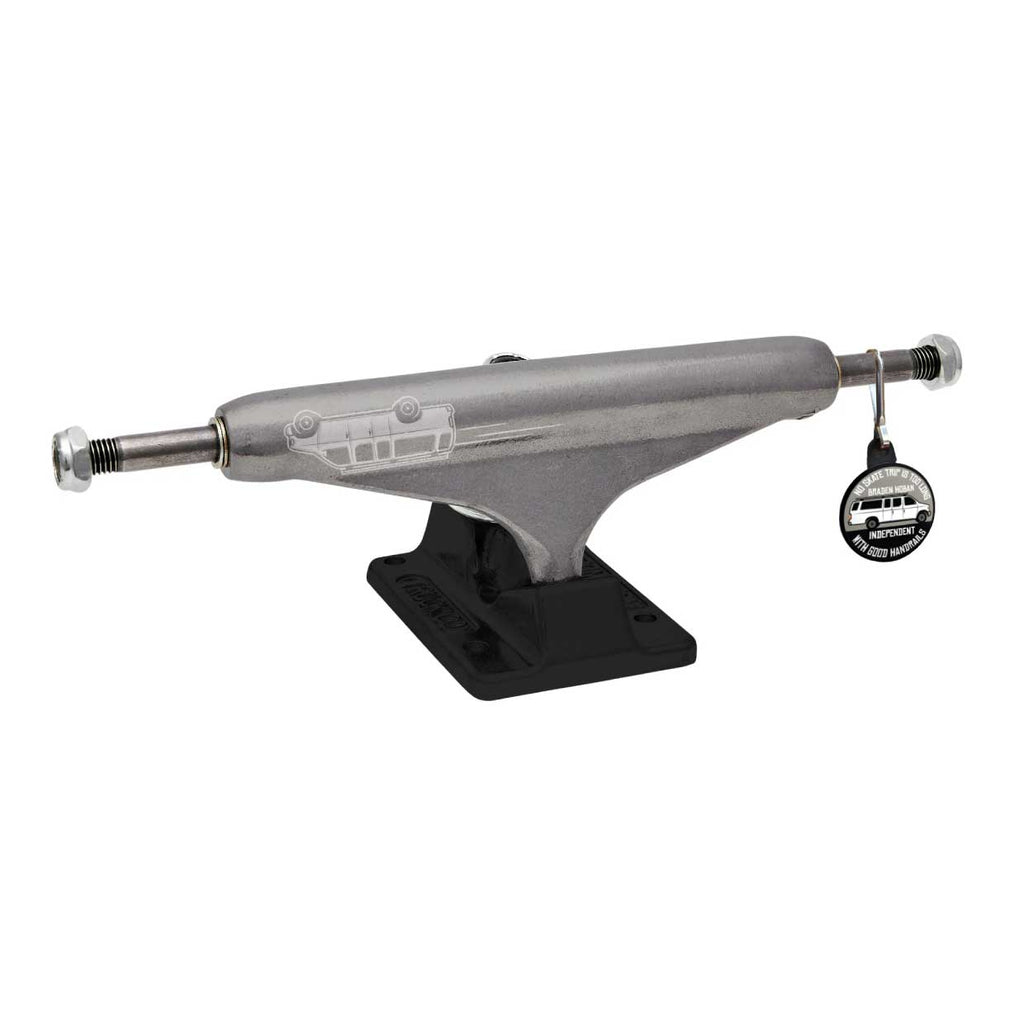 Independent Truck Company Braden Hoban Pro Stage 11 Hollow trucks featuring laser engraved van & Braden Hoban logo artwork on clear flat hanger with flat black fine-textured baseplate, silver hardware, orange cushions, and custom team van punk pin keychain hangtag. No skate trip is too long with good handrails.