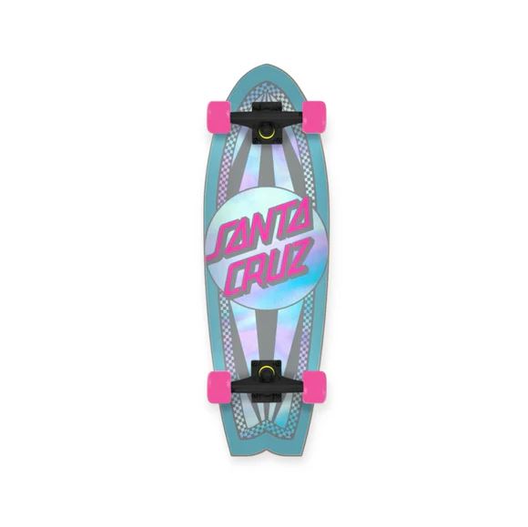 Santa Cruz Skateboards Prismatic Dot Shark Cruzer with spot gloss and silver rainbow prismatic foil print on blue, pink, and natural veneers. 7 ply surfboard inspired shape with 140mm Bullet trucks, angled risers, and 65mm 78a wheels.