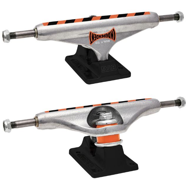 Independent Truck Company Stage 11 Built to Grind trucks align with Indy's Built to Grind apparel collection, featuring DIY inspired orange-and-black striped construction tape and labeling details, polished silver hanger with laser and printed Span BTG logo, grind off tape print, anodized black baseplate with BTG pivot housing stamp, laser etched logo on bottom, silver hardware, and orange cushions.