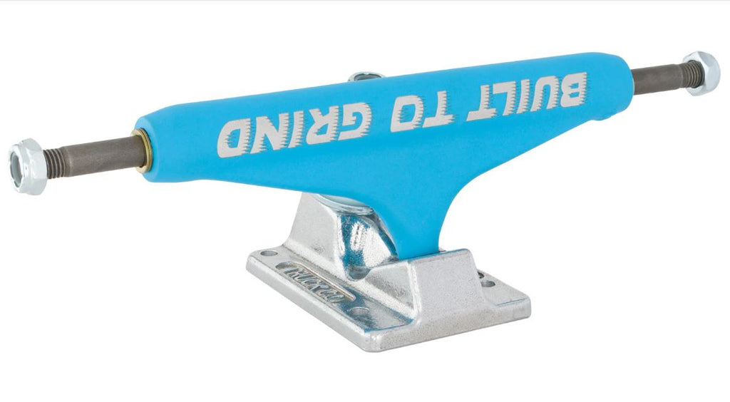 Independent BTG Speed trucks feature flat light blue hanger with Built to Grind laser etched logo and polished silver baseplate, silver hardware, and white cushions.